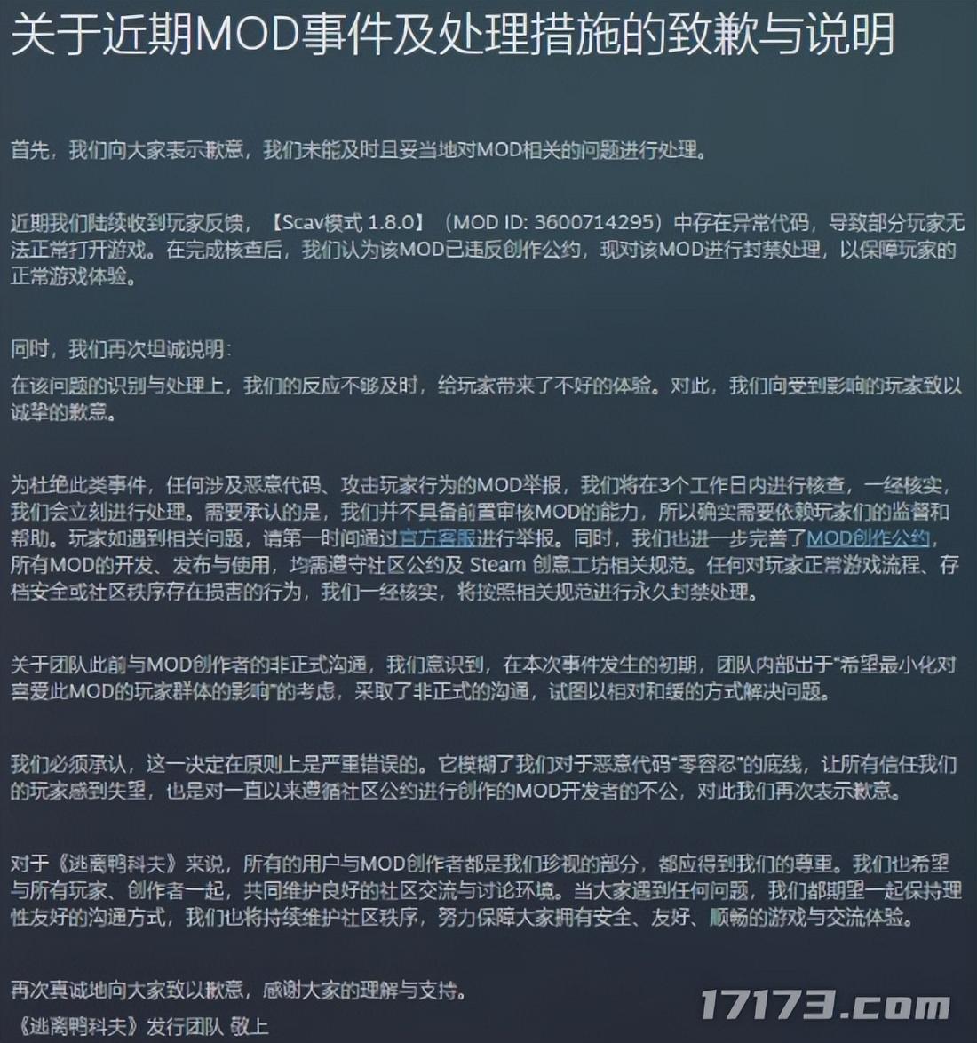 近日,由於《逃離鴨科夫》的創意工坊中出現了會影響遊戲的惡意MOD,於是《逃離鴨科夫》的官方,也被捲入了輿論風暴。