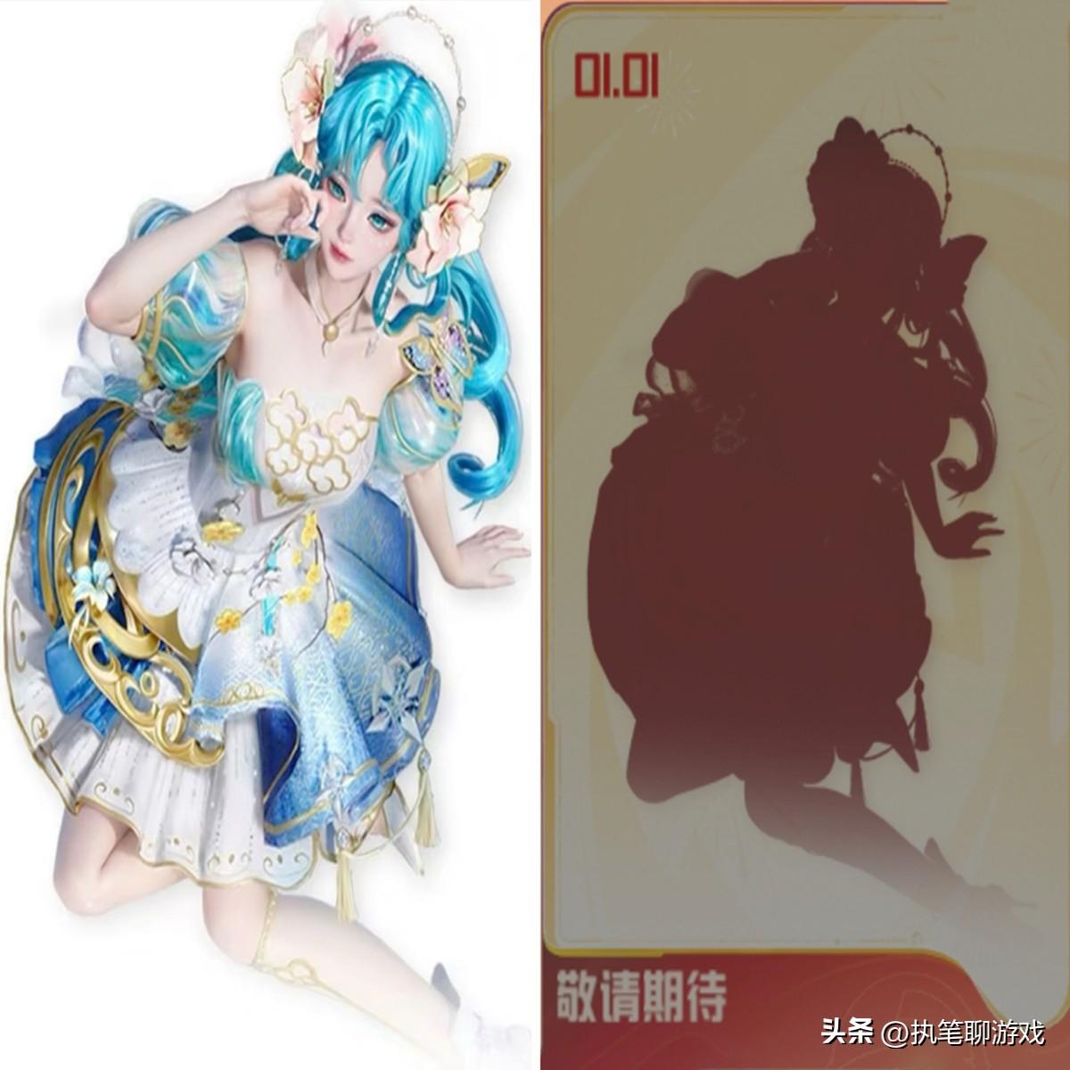 如圖所示,當初很多玩家比較看好的第2個黑色剪影,認爲是此次的新紅裝,但是伴隨着“原畫”出現之後,答案可以確定爲“珍藏寶箱”,而這個藍色髮型、頭戴鮮花的女角色,就是該軍需裏的C位。