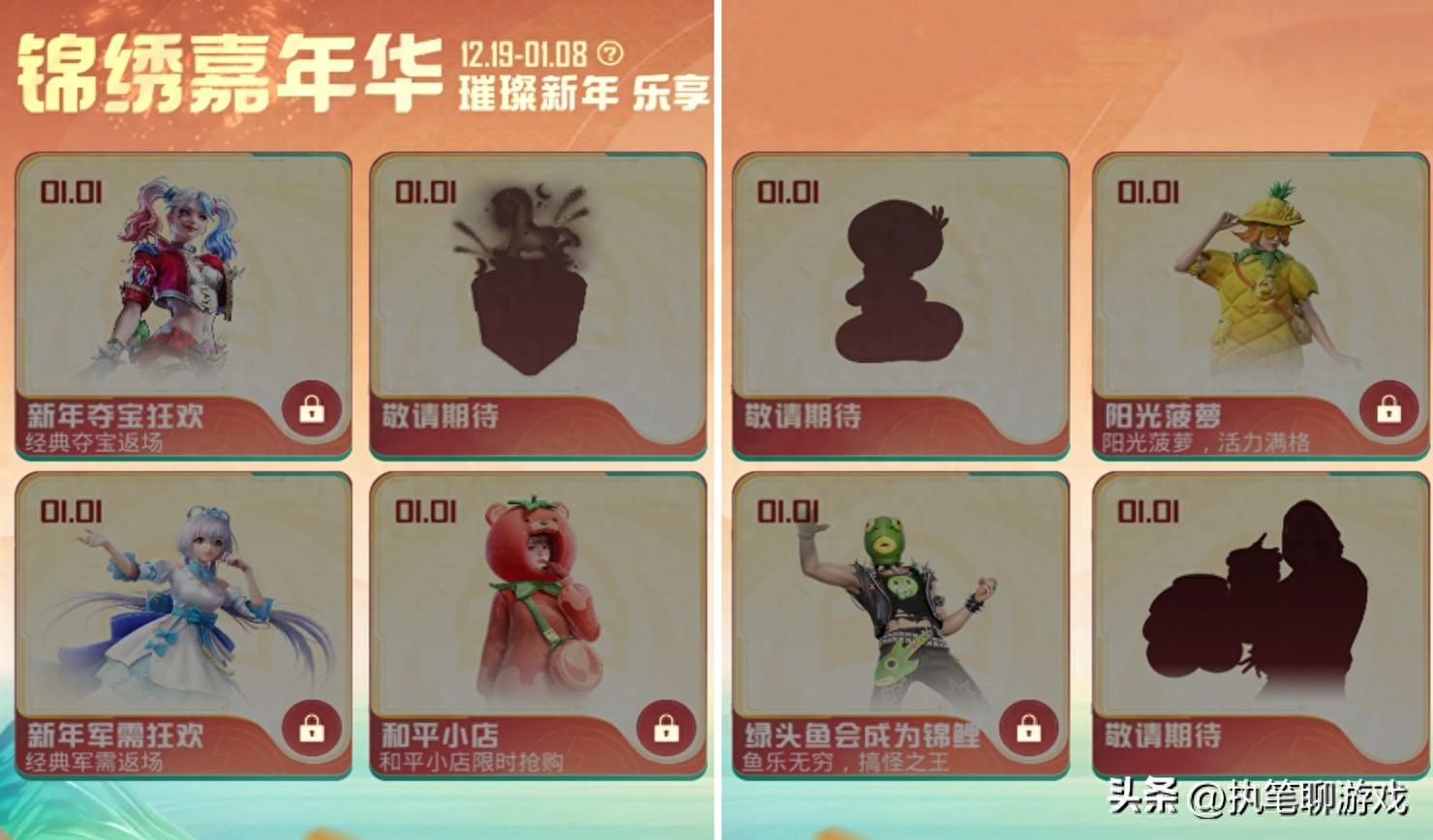 在此次《和平精英》元旦的“錦繡嘉年華”裏,一共出現了14個黑影,以陸續分批次的方式來進行公佈。到目前爲止,光子公佈了5個答案,分別是9個奪寶轉盤、9個珍藏寶箱的返場、和平小店、綠頭魚、陽光菠蘿。