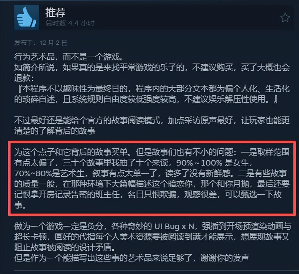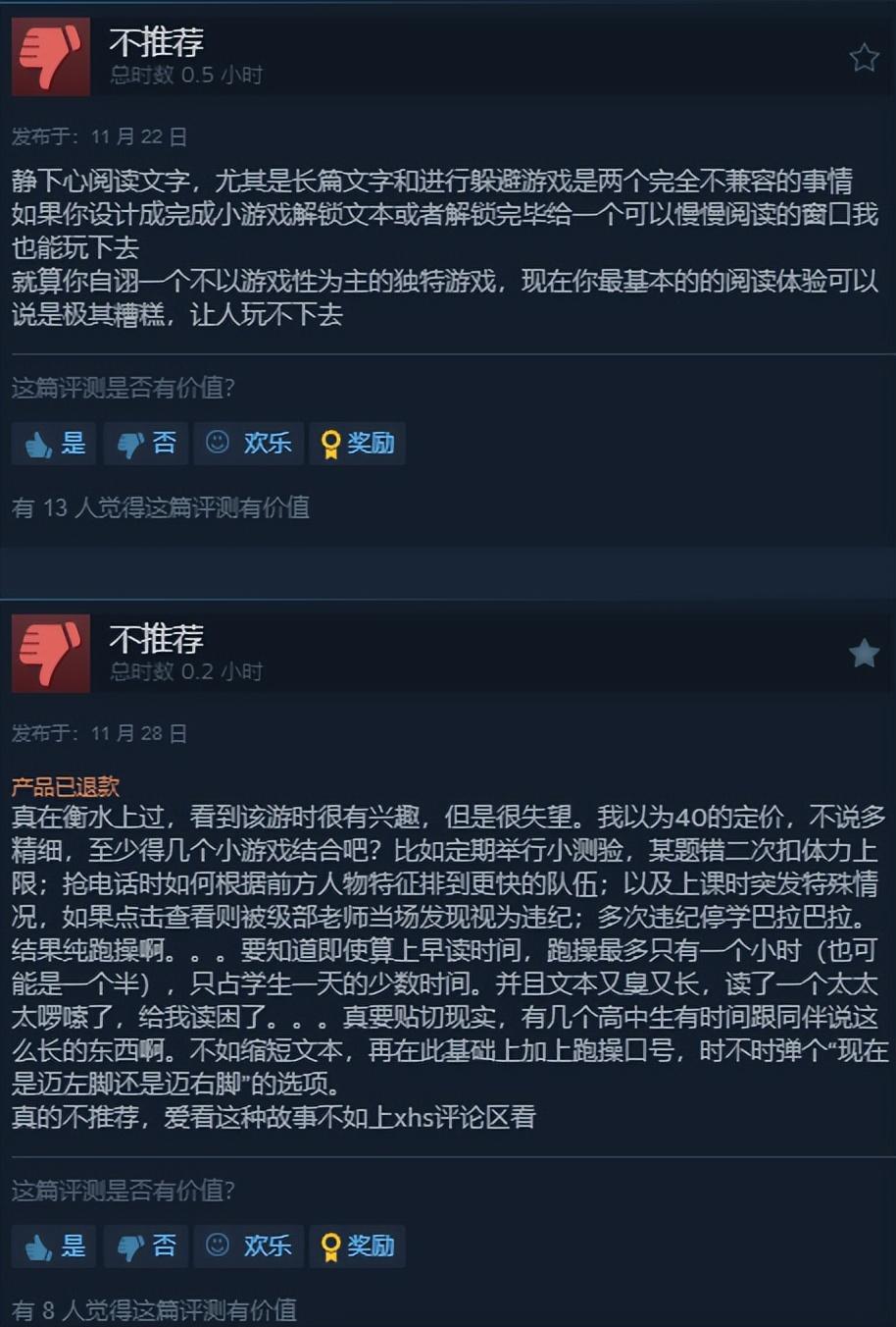 截稿前,它在Steam上的評價只有10條,其中5條都是差評和抱怨,大多評論無非是:遊戲高昂的定價與匱乏的玩法相悖、打斷式閱讀與全篇大段的文本相悖、遊戲這一載體與薄弱的遊戲性相悖,這幾點。