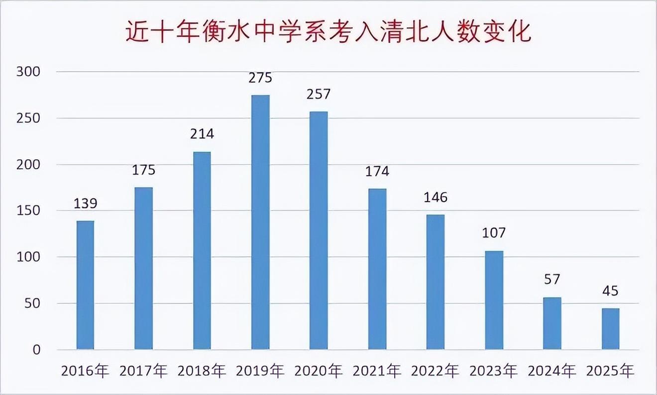 這並非是先造神後毀神的又一次重現,而是有着事實依據的推論。從網傳的數據來看,諸如衡水中學、衡水二中等衡水系學校的清北總錄取數,由2019年巔峯期的275人,連年腰斬。到今年,只剩下了45人左右。