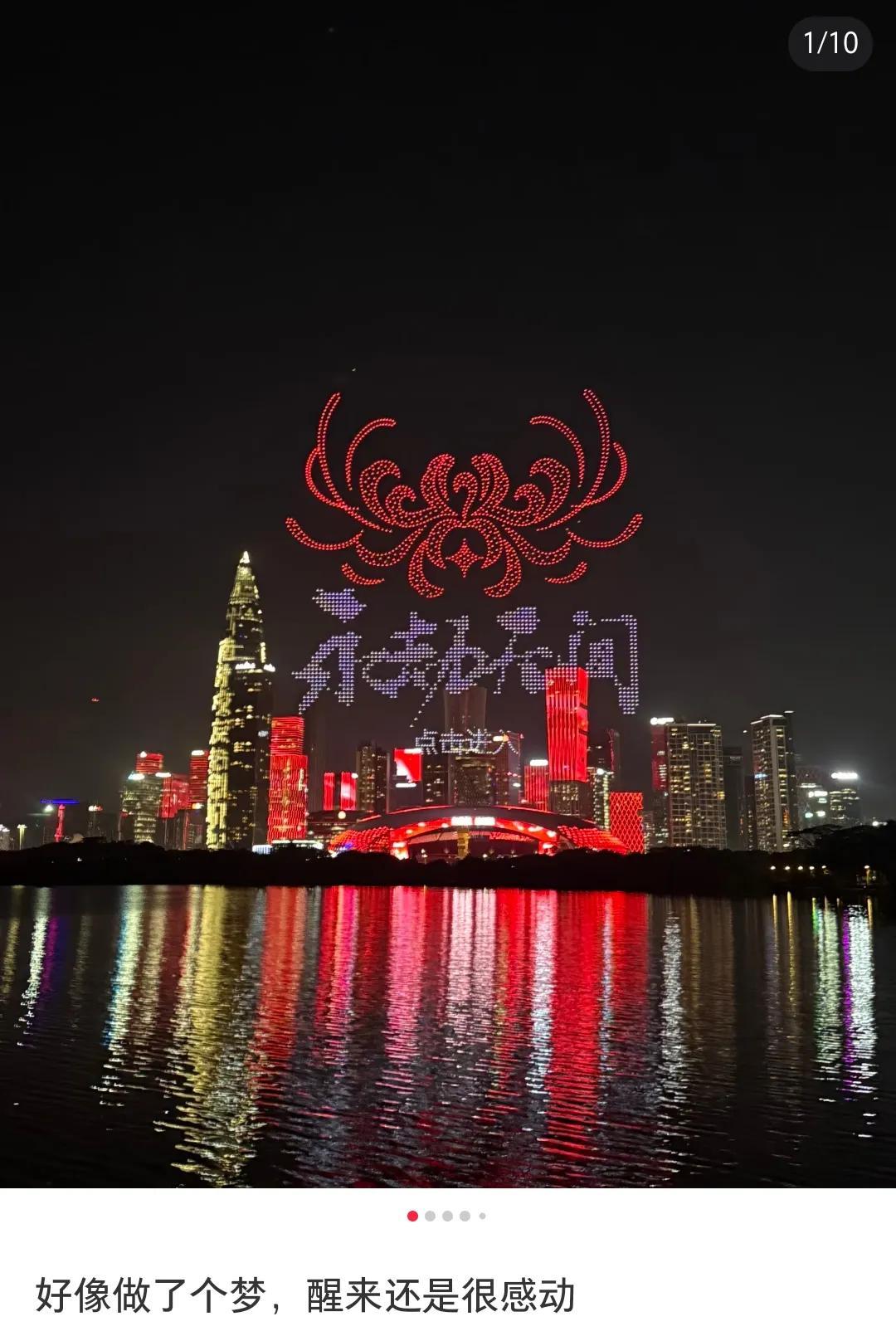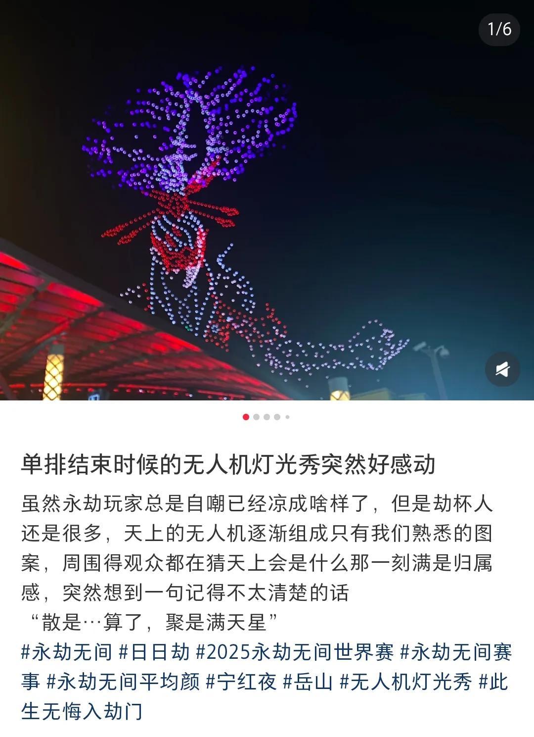 我還記得週六晚上,單排冠軍“無風”黑馬奪冠後淚灑當場,全場觀衆起立鼓掌。而走出場館後,前面不少人突然停下了腳步,望向天空。我下意識回過頭,發現“春繭”紅色的屋頂上方,無人機編隊正以《永劫無間》的圖像點亮夜空。大家不約而同地舉起手機,似乎都想把這一夜,連同那漫天紅光一起,定格在相冊裏。
