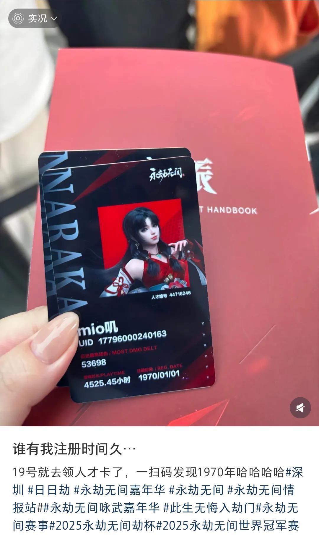 除了之前提到的巨型寧紅夜雕塑,《永劫無間》還搞了個“深振人才卡”的neta設定,用帶有城市特色的身份認證,構建玩家認同感。而在打印時,有玩家觸發了系統bug,註冊時間顯示成了1970年,帖子發到網上,立馬有人在評論區吐槽:“聚窟洲來了個元謀人。”