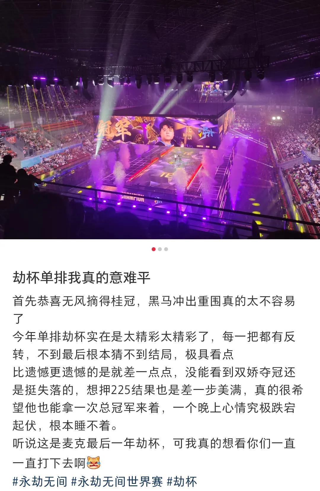 核心當然是比賽。劫杯總決賽在春繭體育館連打兩天。葡萄君全程參與,坐了13個小時。現場不僅請來了希林娜依·高和胡彥斌熱場獻唱,還有12位單排選手和12支三排隊伍高強度廝殺,單排冠軍“無風”黑馬奪冠後淚灑當場。