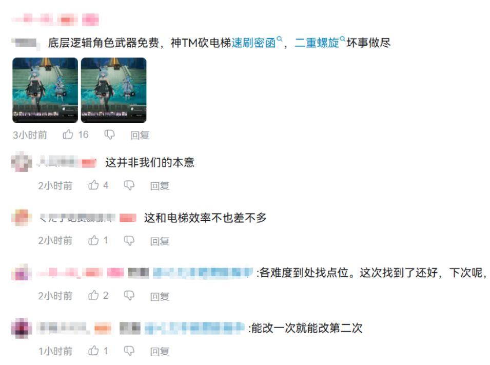 首先引起玩家討論的,就是“電梯”刷怪點位的改動。在《二重螺旋》中,密函是獲取角色的重要素材,地圖上某些固定點位的怪物刷新速度極快,被玩家發現後,成爲可通過掛機快速獲取密函的“寶地”,在社區中廣爲流傳。新版本中,官方調整了這些點位的刷怪頻率,導致玩家無法在原地高效刷取,引起了玩家的不滿。這一改動也讓許多玩家擔心,遊戲未來會變得越來越“肝”。