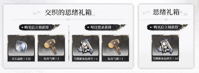 而在新版本中,官方新增了思緒禮箱。該內容可以通過購買後每日登錄獲得一定的資源,而在這個禮盒中,官方把角色碎片放入領取內容中。這樣的形式相對於直接購買角色碎片,做了一定力度的折扣,可以讓玩家負擔更少的獲取新角色,降低了新角色的養成門檻。