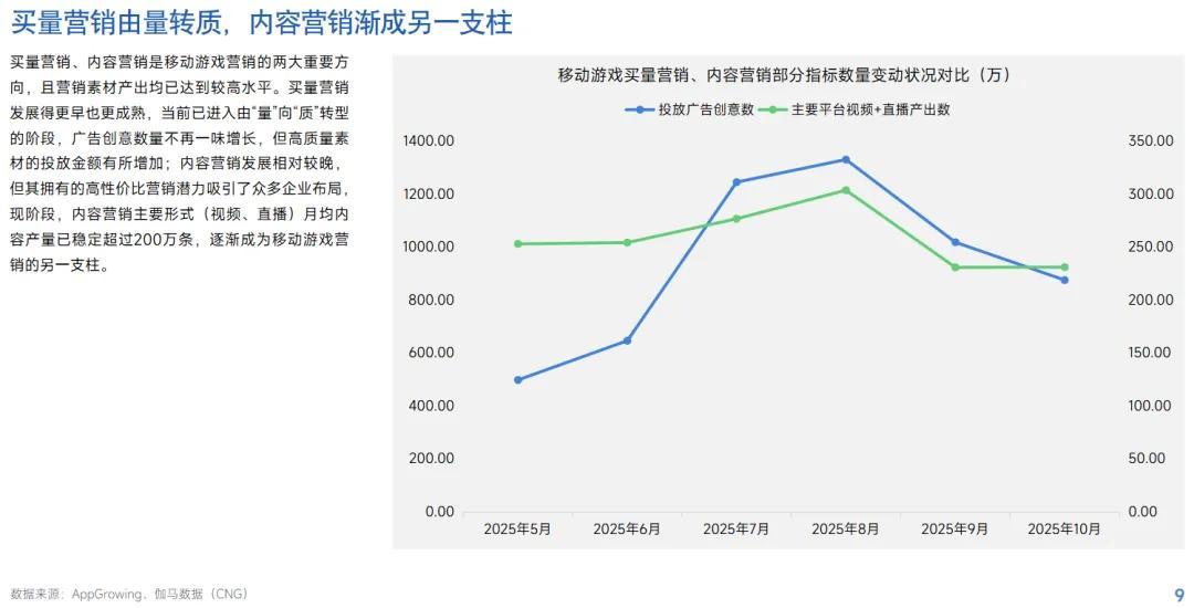 報告也給出了原因,即移動遊戲營銷「由量轉質」:廣告創意數量不再一味增長,但高質量素材投放金額在增加;內容營銷的高性價比潛力吸引衆多廠商佈局,其主要形式(視頻、直播)月均內容產量已穩定超過200萬條。