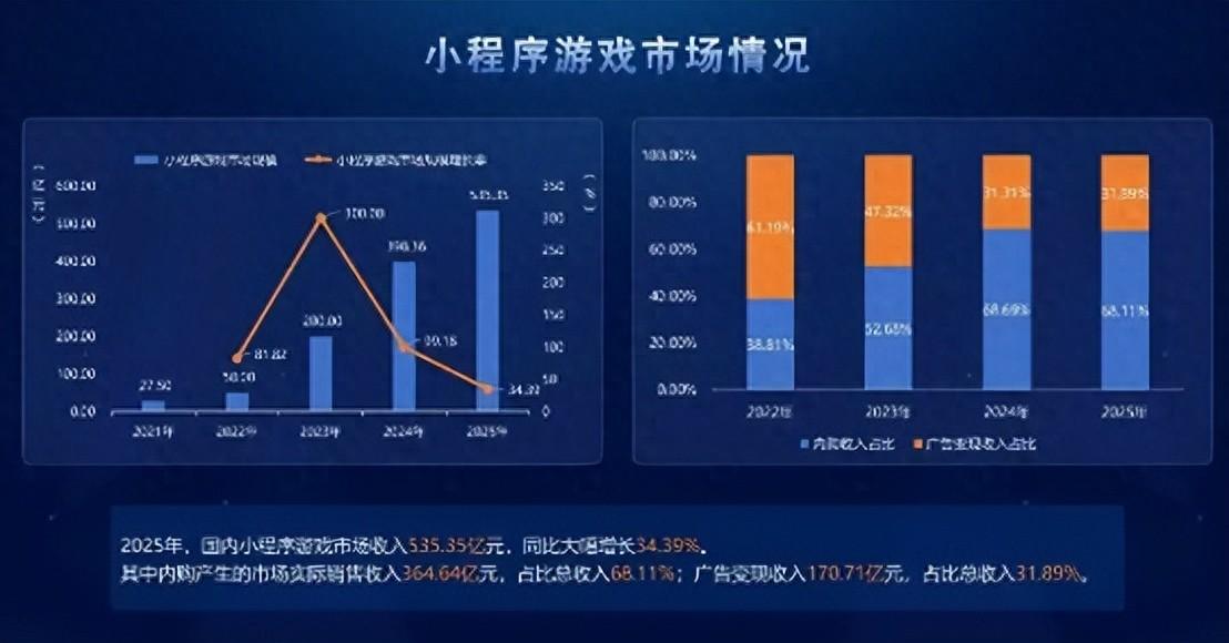 2025年小遊戲大盤535.35億,較去年增長137億、增幅34.39%。其中IAP有364.64億,佔68.11%;IAA有170.71億,佔31.89%。