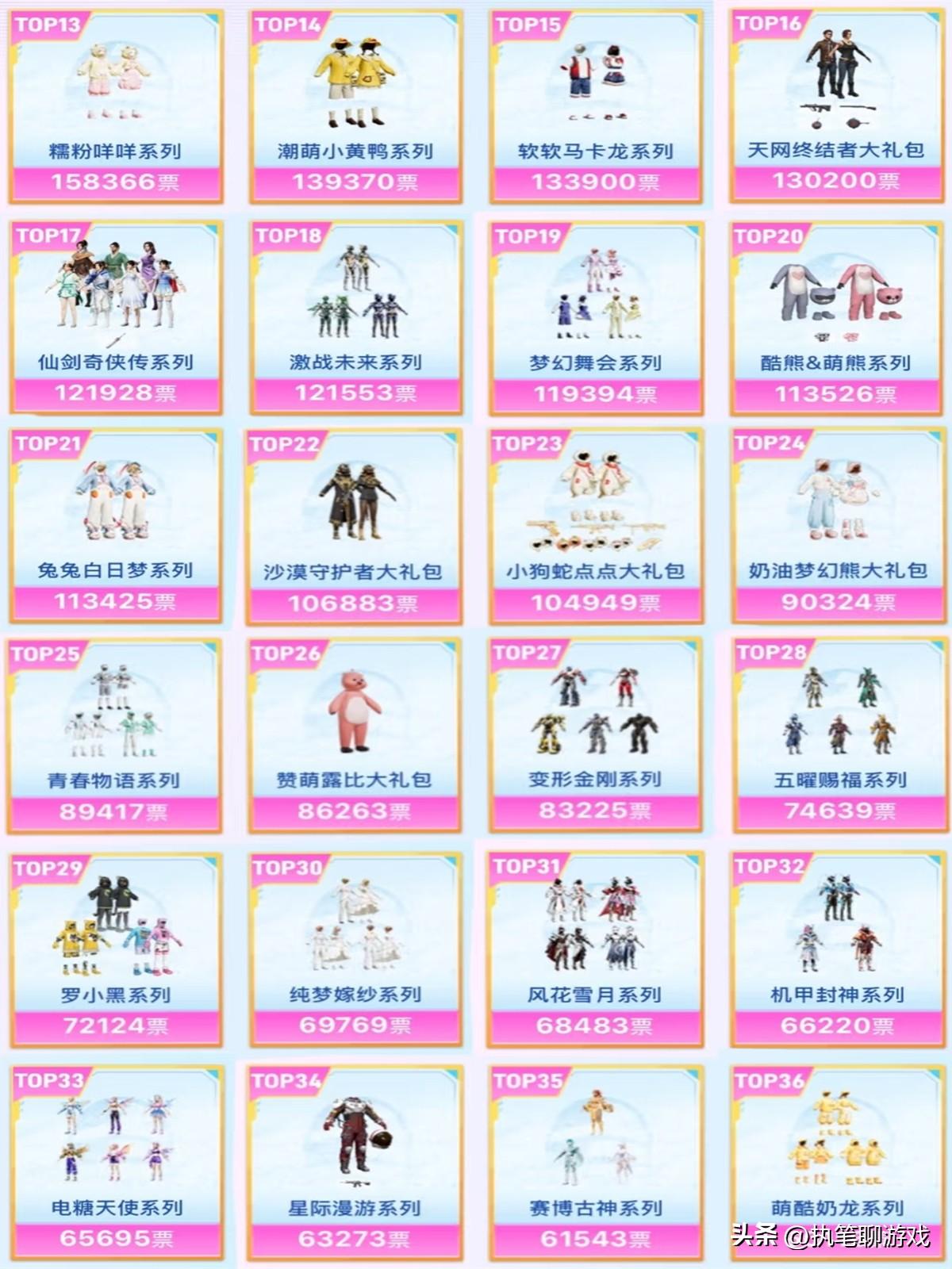 接下來則是第13名到第36名,由於數量較多的緣故,而且目前尚未進行分組,所以就不再一一點名,大家可以根據圖中所示自行翻看。PS:未進入前36名的經典系列,將無緣此次返場,進入前36名的經典系列,也不代表100%返場,還要根據後續的“紅藍陣營”來確定答案。