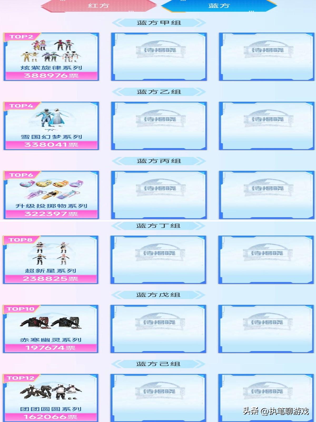 如圖所示,其中的藍方陣營分別是:炫紫旋律、雪國夢幻、升級投擲物、超新星、赤寒幽靈、團團圓圓。