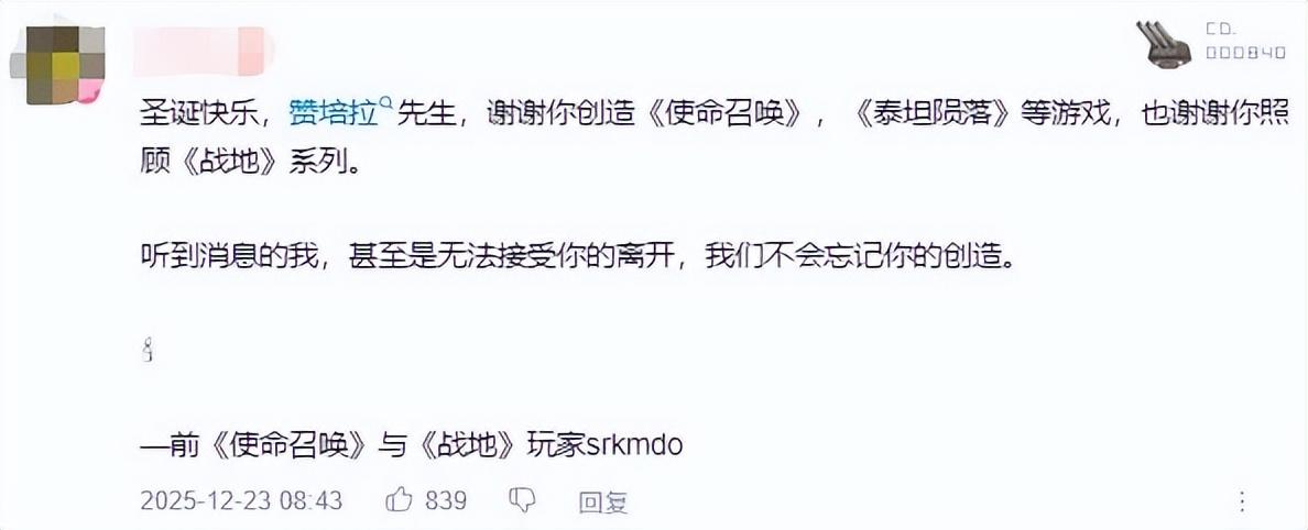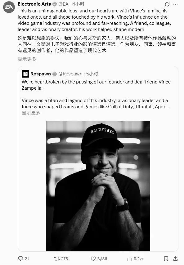 在他的帶領下,Respawn於2017年被EA收購,成爲該公司的重要支柱。2021年,文斯·讚佩拉被EA任命爲《戰地》系列總負責人。他操盤的《戰地6》於今年12月初強勢迴歸,首周銷量突破650萬份。