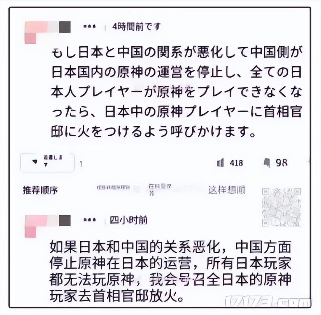 “要是因爲中日交惡玩不到原神,我就號召全日本原神玩家,去首相官邸放火。”