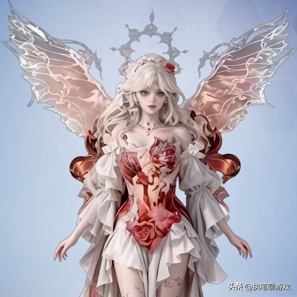 如圖所示,第2個版本里的模樣就從“鄰家小妹”變成了“傲嬌御姐”,同時又呈現了多個主題,比如白色的翅膀、玫紅晚禮裙等,雖然只是“半身像”,但是已經完美演繹出什麼叫“膚白貌美”了。