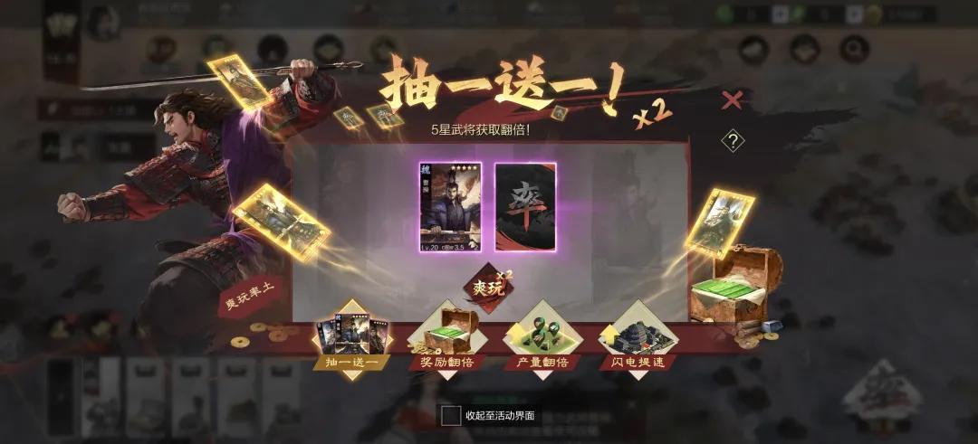 爽玩版的設計邏輯,乍看之下簡單粗暴,就是通通加倍:五星抽卡雙倍、土地產出資源、戰法經驗……你可以把它理解成遊戲自帶了一個2倍速的「爽遊」模式。