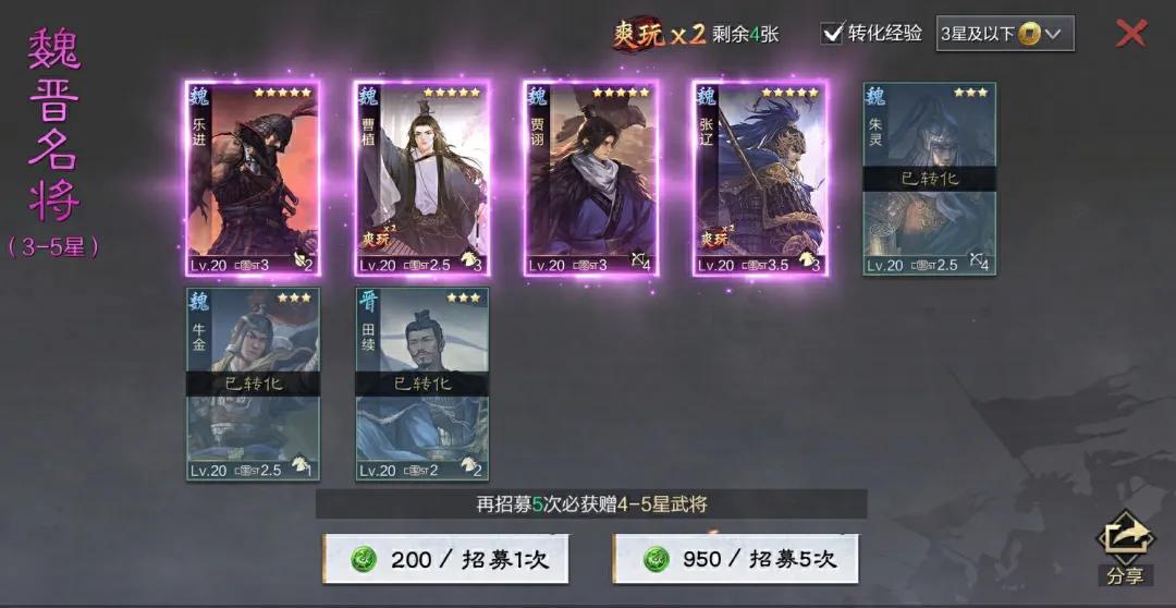 不過以上都不是最爽的,爽玩版真正讓人慾罷不能的點,還是在於抽卡翻倍——名將卡包招募前10個五星武將時,可額外免費再獲得一張同卡包的五星武將。