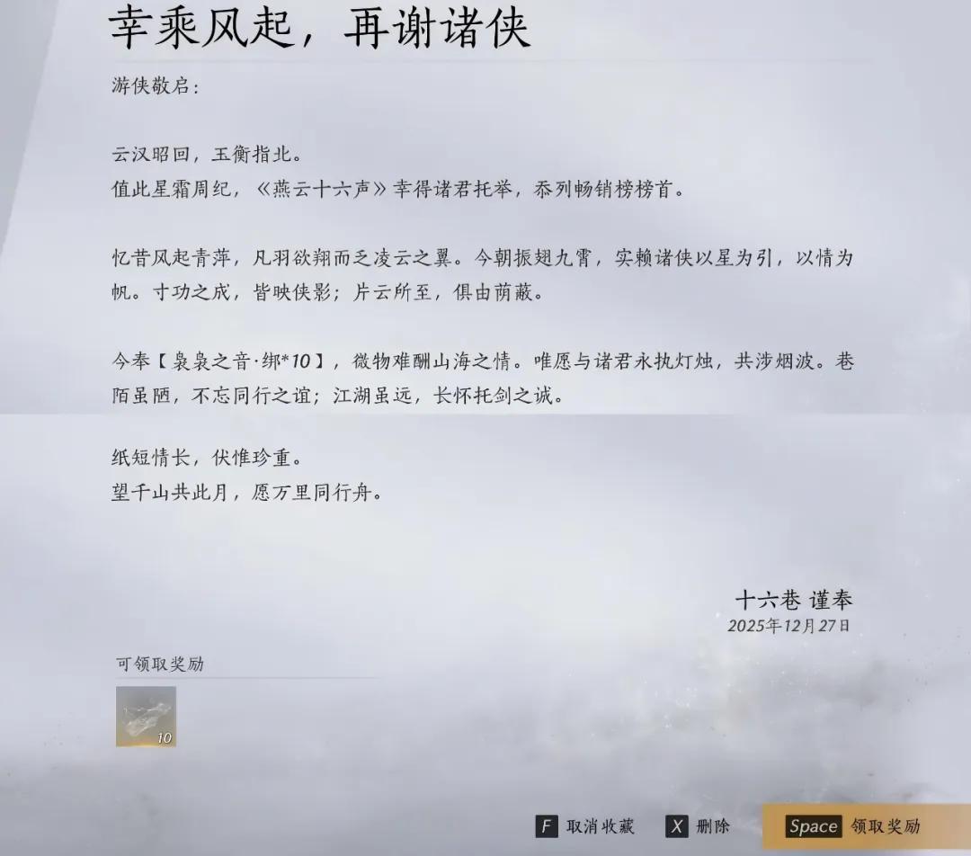 官方在遊戲內向玩家表示了感謝,並送出了10個嫋嫋之音(抽卡材料)。