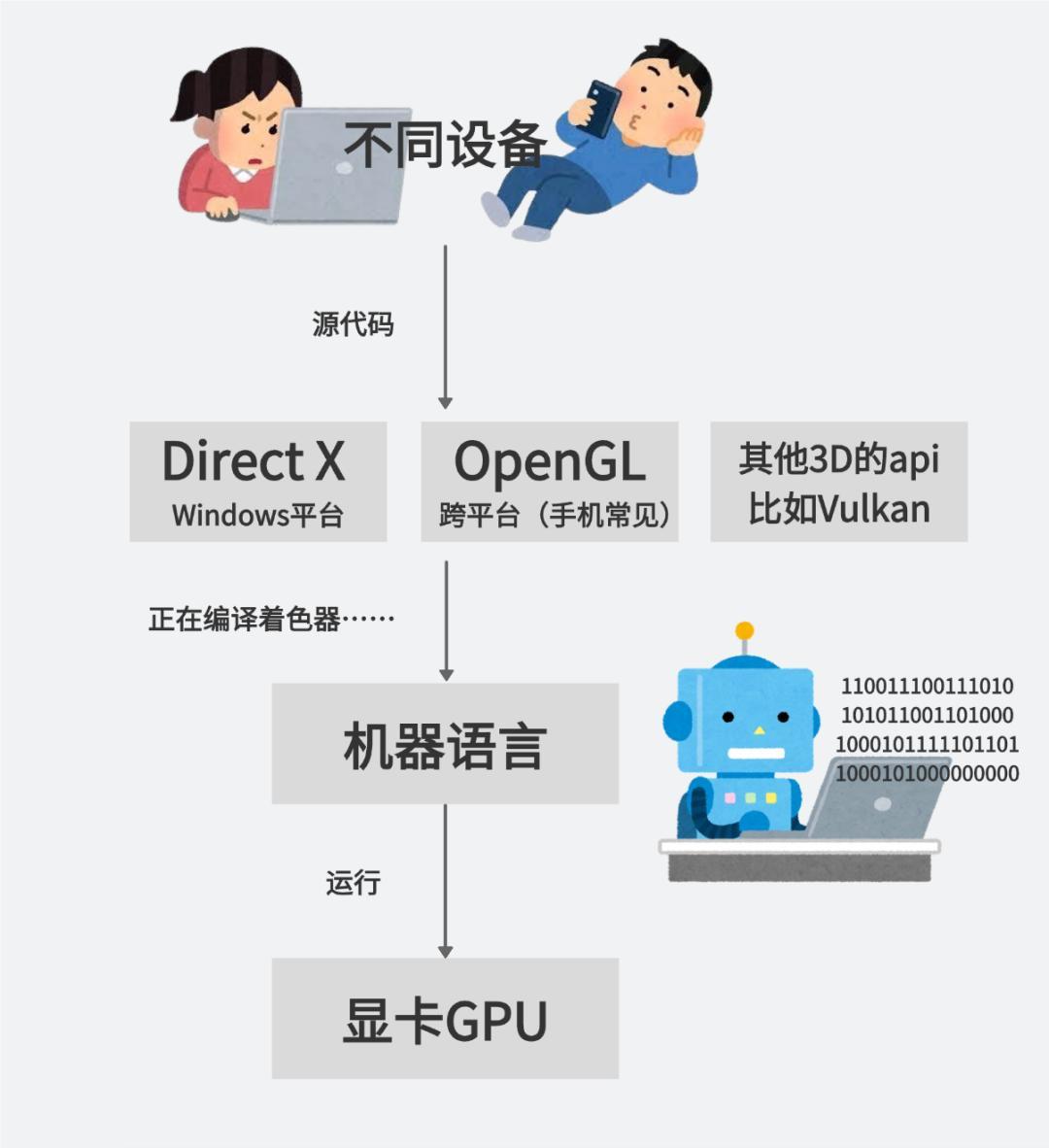 ——將程序員編寫的代碼,翻譯成機器能看懂的二進制指令(0和1)的這個過程,就叫作“編譯着色器”。網上解釋的視頻很多,感興趣可以搜一搜。