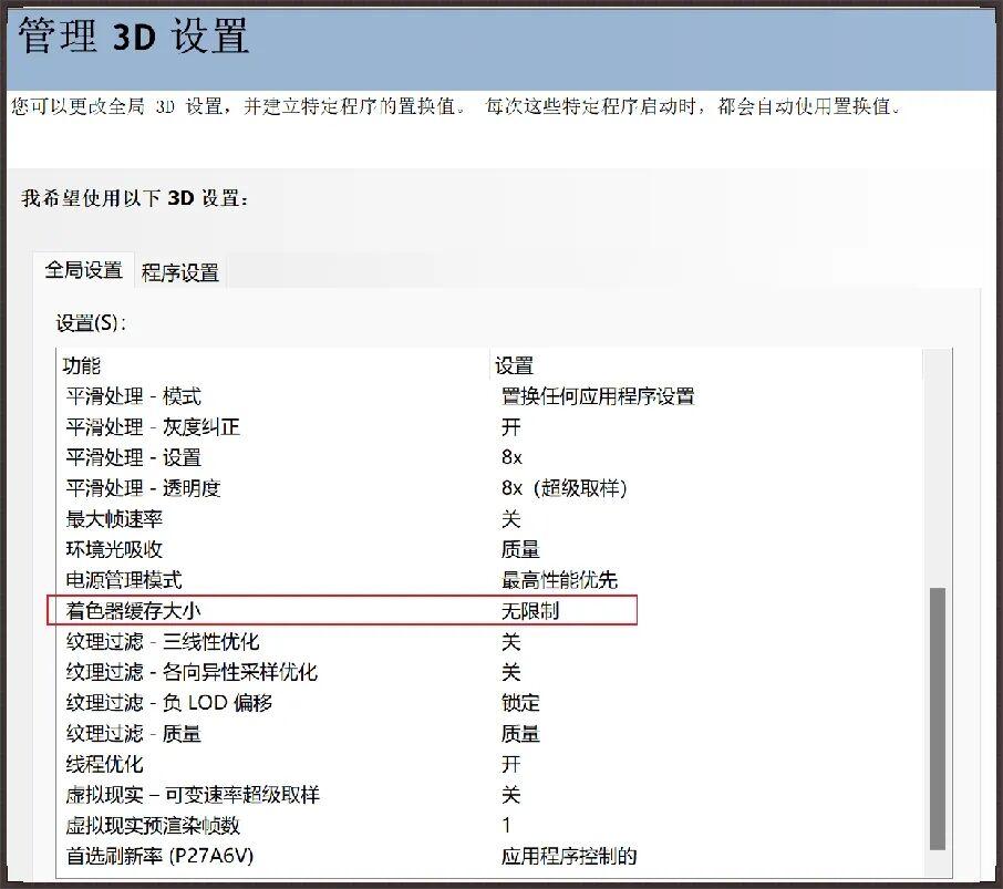 另外,我記得NVIDIA 控制面板裏也有一個“着色器緩存大小”設置,默認通常只有512MB(放C盤上的),導致了很多動態編譯的遊戲切換時會搶佔空間。