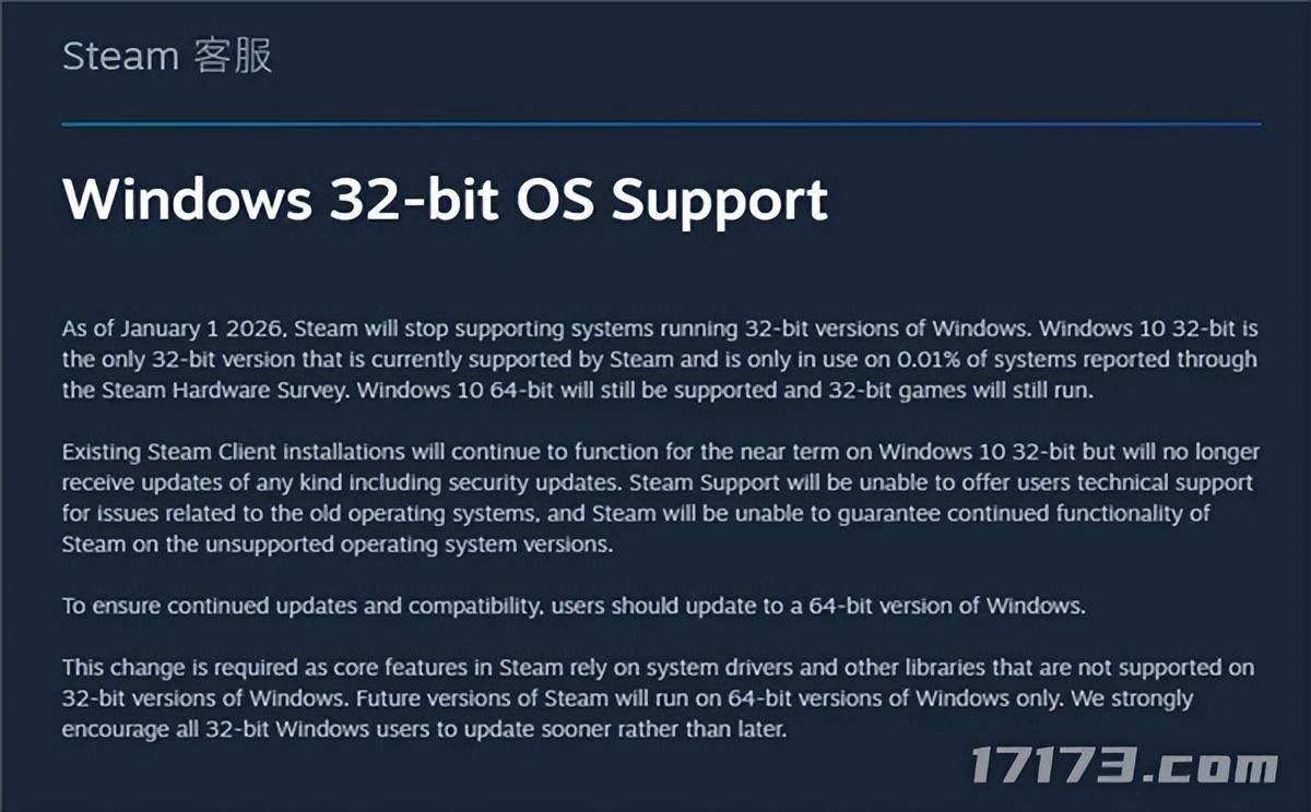 劃重點:Steam客戶端2026年1月1日起停止支持32位Windows系統