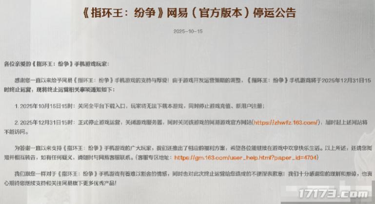 由於遊戲開發運營策略的調整,《指環王:紛爭》手機遊戲已於10月份關閉了全平臺下載入口,並將於2025年12月31日15時終止運營。