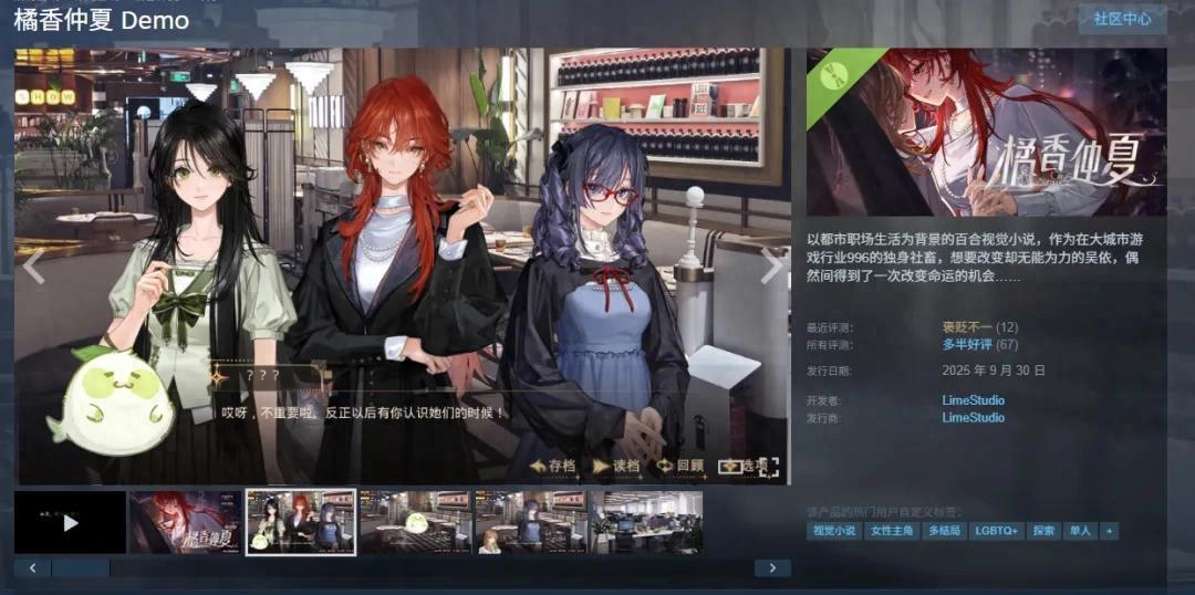 最終團隊立項了《橘香仲夏》這款職場題材的百合文字AVG,試圖記錄當代職場人困境的遊戲,把那種996的疲憊、被優化的恐懼、以及在鋼筋水泥中尋找慰藉的渴望都融入遊戲中。