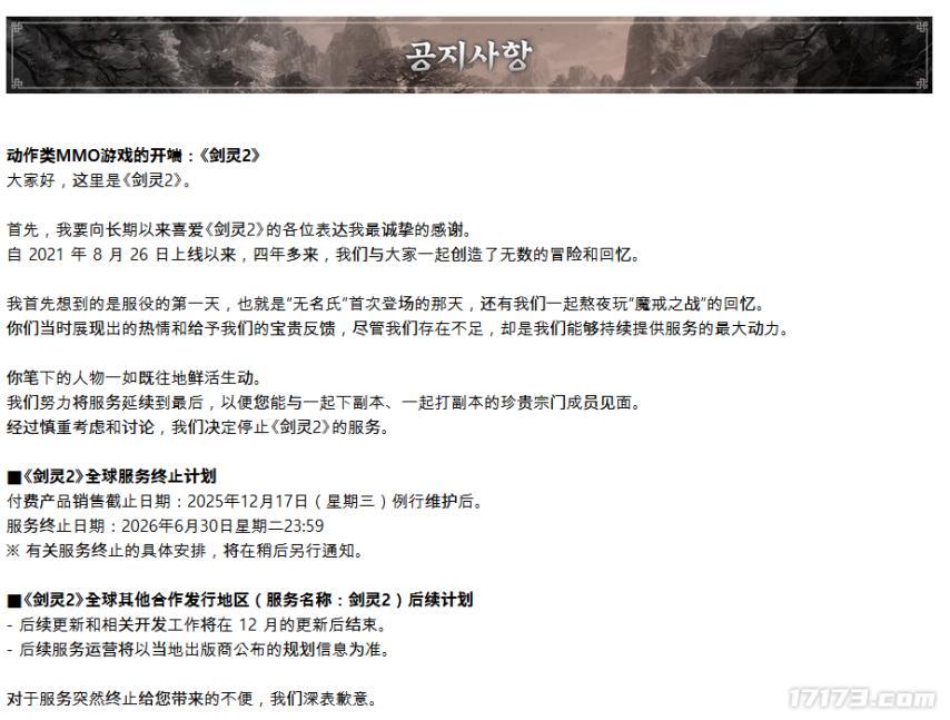 其中,《昊緣》將於2026年2月28日結束全球服務,而《劍靈2》全球服則定於2026年6月30日停運,國服亦進入“服務階段性調整”狀態。