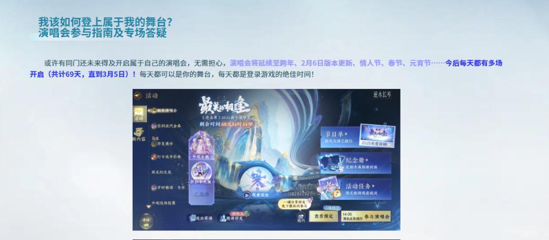 事實上,這次跨年演唱會,也很能體現這種不爭不急的設計理念。從26日起,遊戲內的演唱會準備了長達69天的活動週期,玩家完全可以根據自己和朋友的生活節奏,調整參與的時機。不會存在活動上線,就立刻開啓“手快有手慢無”的緊張感,讓每個人都有足夠餘裕去體驗和記錄自己想選擇的內容。