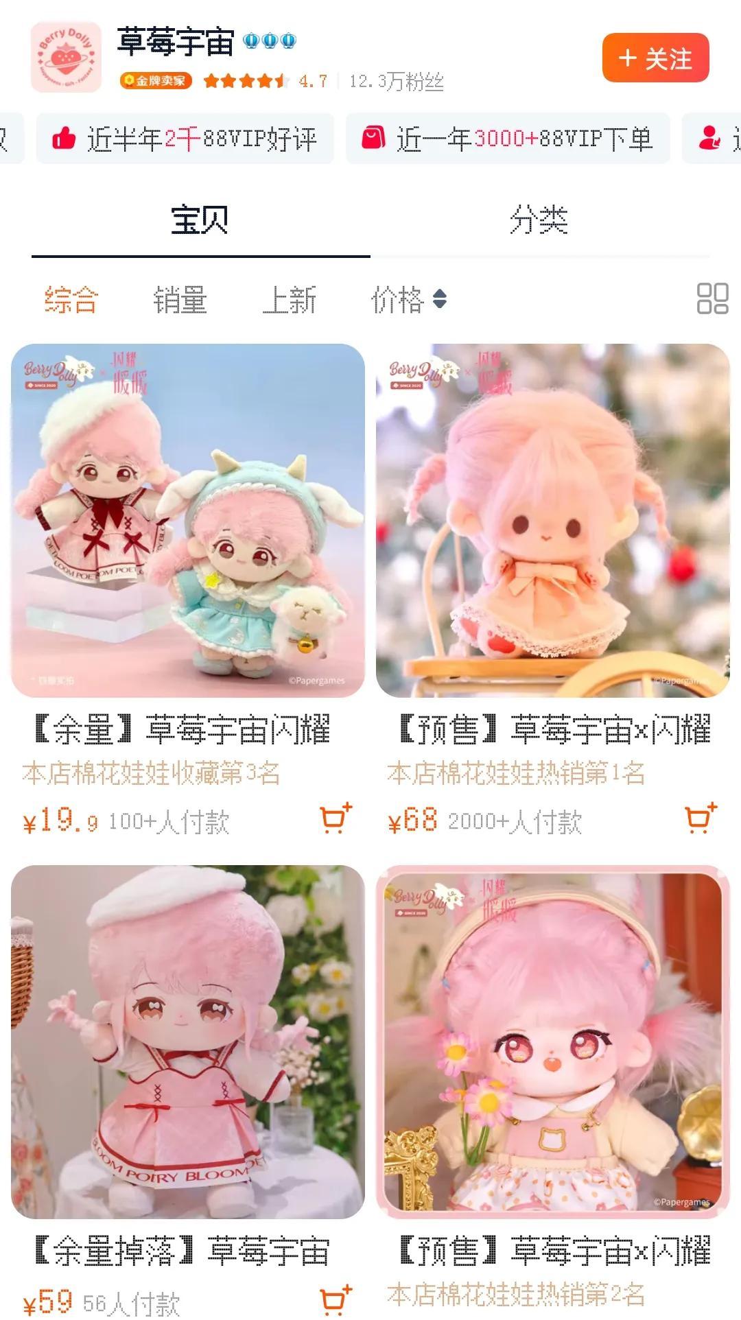 米哈遊擁有龐大的Z世代女性用戶羣體,面向這一垂直領域投資並不奇怪。實際上,點開十二光年旗下的品牌店,你會發現店內的主要商品是閃耀暖暖IP的棉花娃娃。在衍生品領域中,這同樣是一個熱銷品類。