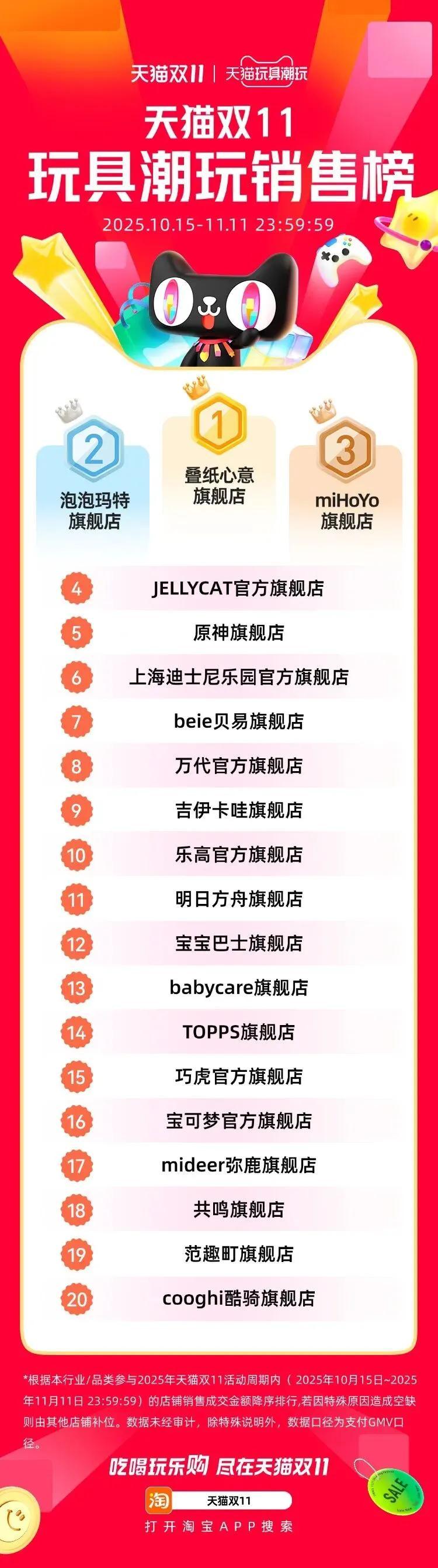 這些遊戲公司,在近幾年大火的穀子經濟裏順風順水,在不少榜單上殺得七進七出,和頭部潮玩公司坐一桌——2024年和2025年雙十一,疊紙和米哈遊的旗艦店,都在天貓玩具潮玩和潮玩行業雙榜上,和泡泡瑪特一併位列前三。