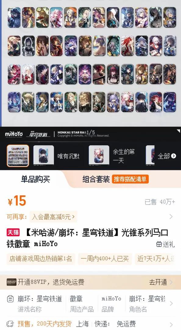 點開這些店鋪裏賣得最火熱的吧唧的商品頁面,你會發現即使是200天內發貨的預售商品,銷量也均在十萬量級。據三文遊調研和估算,米哈遊旗下IP單論吧唧的銷量就在億級,利潤達到十億元級別。
