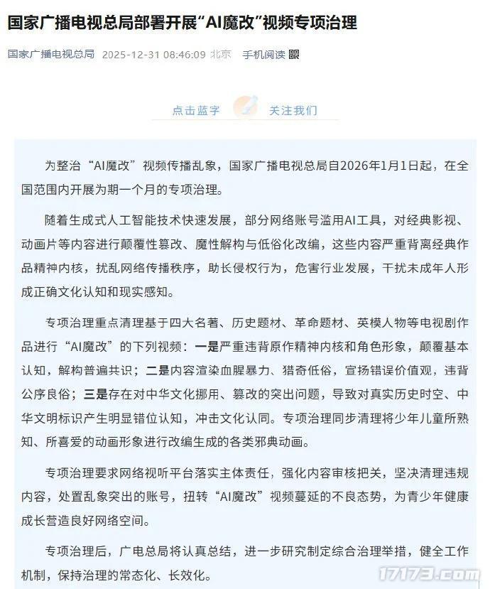 12月31日,國家廣播電視總局正式發佈通知,宣佈自2026年1月1日起,在全國範圍內開展爲期一個月的“AI魔改”視頻專項治理行動。