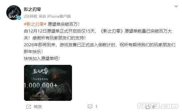 12月29日,《影之刃零》官方宣佈:遊戲全平臺願望單數量在15天內正式突破了100萬大關。