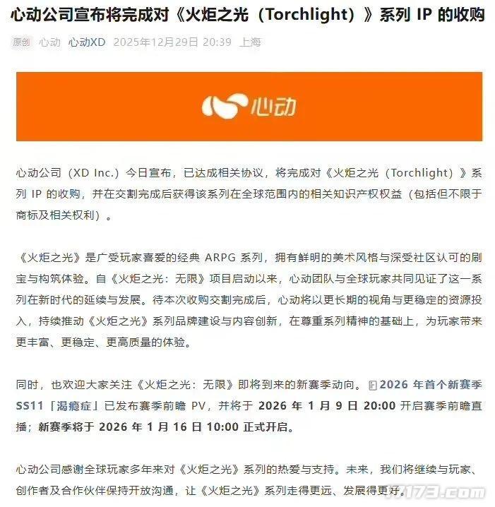 心動公司正式宣佈,已與相關方達成協議,將完成對經典動作角色扮演遊戲《火炬之光》系列IP的全面收購。交易完成後,心動公司將獲得該系列在全球範圍內的全部知識產權權益,包括但不限於商標、源代碼、美術資產、社交媒體賬戶及相關權利。
