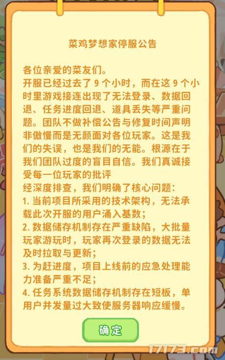 近日,由波波森林研發運營的《菜雞夢想家》給玩家們整了個大活,遊戲不僅開服炸服,還在炸服之後直接停服跑路,共計9小時的開服時間中,玩家能登陸的時間屈指可數。