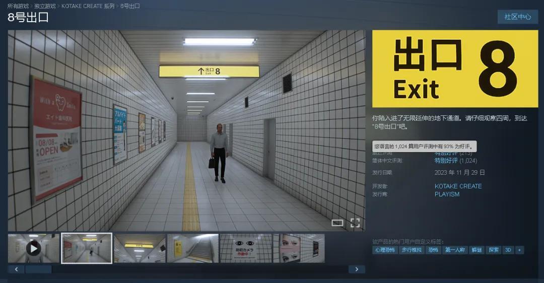 這個玩法,是由幾年前的日本獨遊《8號出口》牽頭創造出來的一個細分類別。這款遊戲不少人想必瞭解過,玩法非常簡單,你在一個地鐵通道里經歷鬼打牆,觀察出周圍是否有異常,選擇走下去或回頭,最終走出循環。
