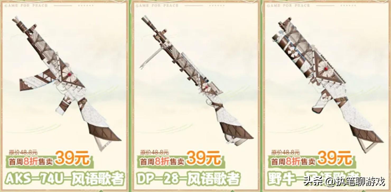 接下來我們來看11個新皮膚,其中的3個槍皮分別是AKS-74U、野牛、DP28,均爲39R;剩餘的8個新皮膚分別是頭盔、揹包、降落傘以及掛件,其中的頭盔與揹包爲72R、降落傘與掛件是23R。