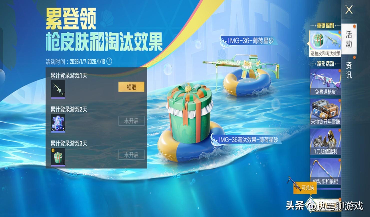 要不是老夥計“荔枝哥”的提醒,天哥還真沒有留意到:12點的遊戲裏出現全新的累登福利,光子不僅拿出MG3薄荷星砂的新槍皮,而且還有專屬的淘汰盒子。