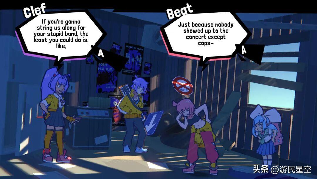 但相對的,通過對話與演奏高潮的頻繁切換,你會發現,《UNBEATABLE》似乎本就不打算老老實實的刻畫一個有深度的世界觀。它更傾向於通過無聊對白中的的慢節拍旋律,調整流程的節奏。
