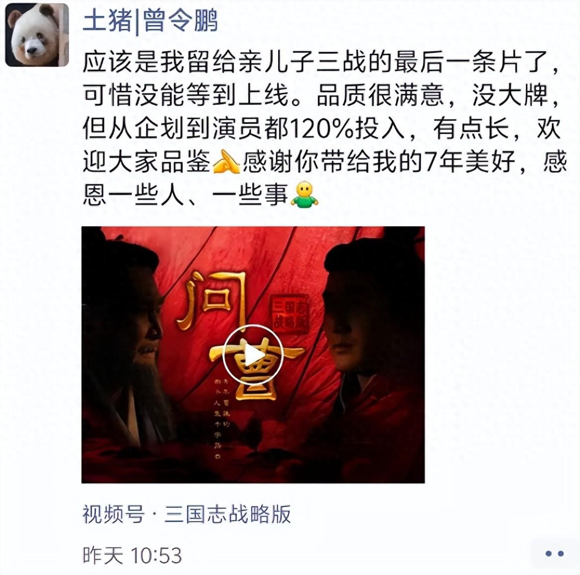 今日,葡萄君獲悉,靈犀互娛《三國志·戰略版》發行製作人豬哥(曾令鵬)已離職,其昨日在朋友圈發文表示「問曹」是自己留給親兒子三戰的最後一條片,感謝三戰爲自己帶來的7年美好。