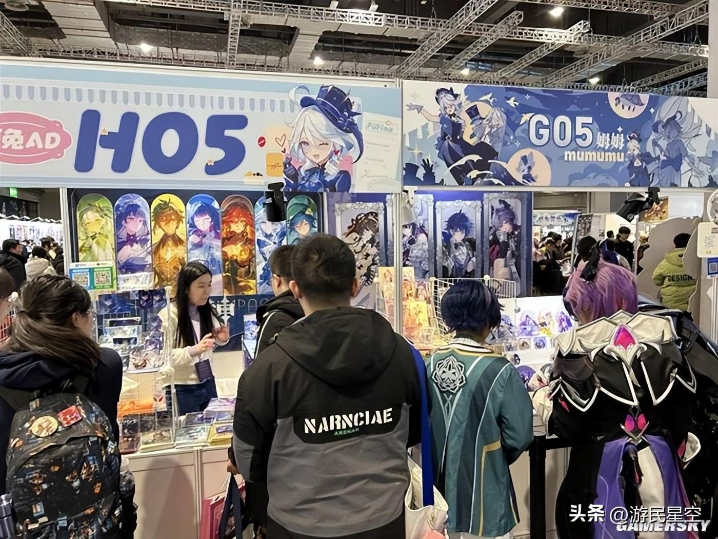 在入口一側,上百個攤位密密麻麻排開,每個攤主都是來自海內外的原神創作者。在這裏,有手工自制的“角色印象”飾品,有精心繪製裝訂成冊的手繪本,也有將社區熱梗實體化的趣味周邊。