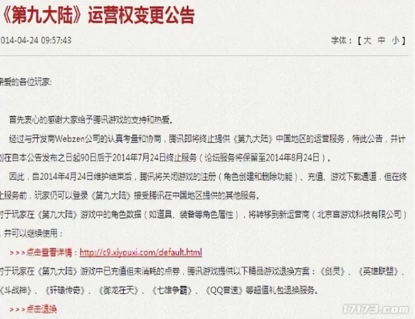 最終,2014年4月,騰訊發佈公告,《第九大陸》停運,從公測到停服,僅僅2年。