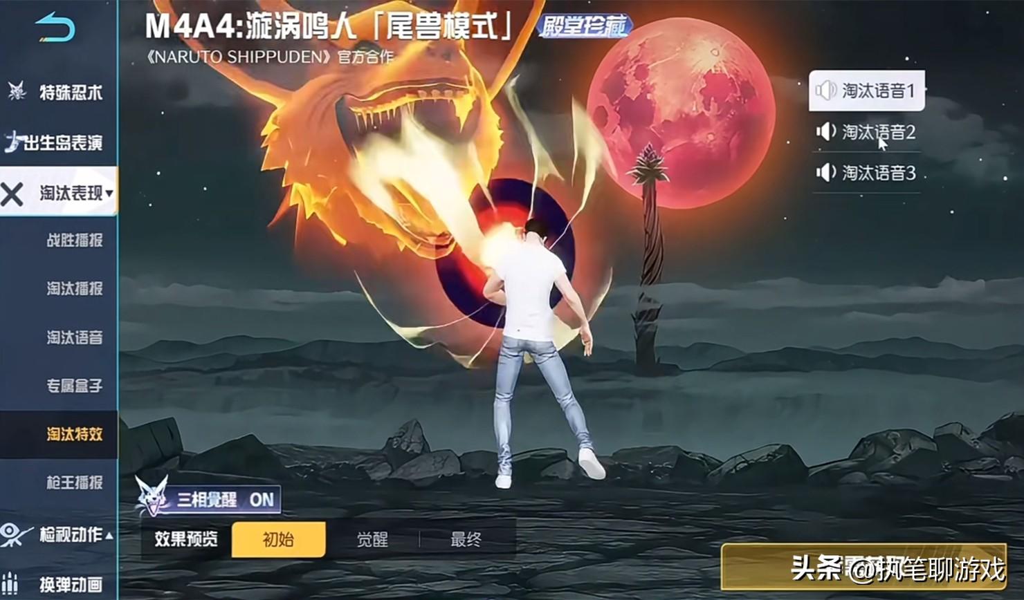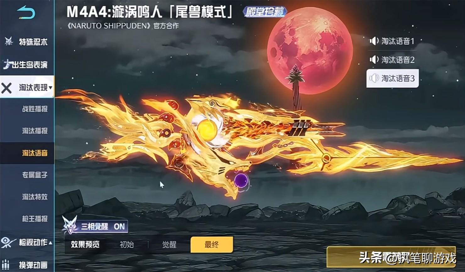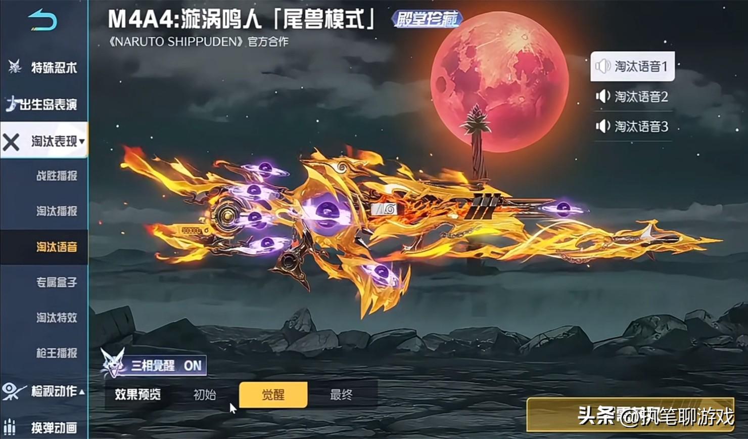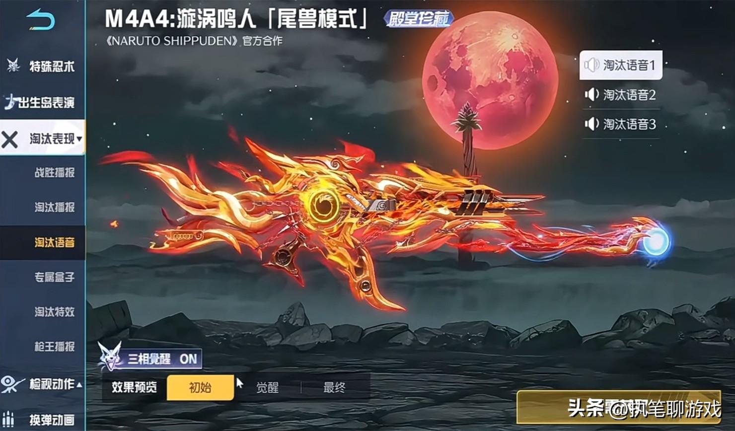 如圖所示,我們以火影聯名系列的M4爲例,就擁有“三相覺醒”的功能,三種外觀分別是初始、覺醒、最終。請注意,這3個外觀並不是基礎、進階、高級,而是對應的三種完全不同的形態,玩家們可以自由切換任意一個。