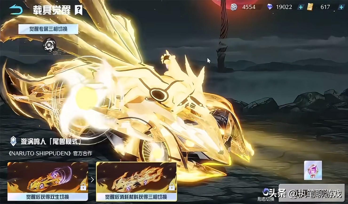 如圖所示,漩渦鳴人系列的載具裏,我們可以看到覺醒後獲得雙生切換,覺醒後消耗材料可以獲得三相切換。
