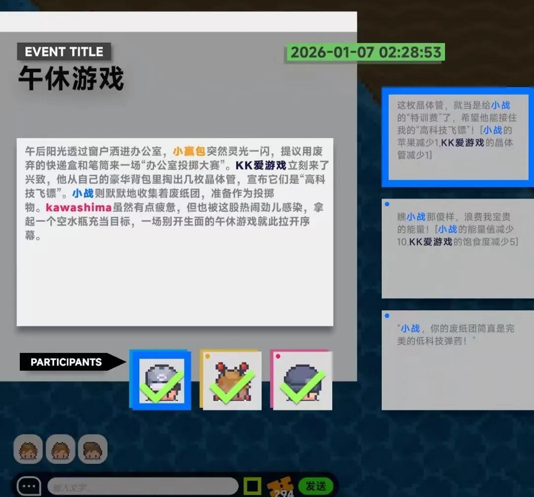 近期新版本上線後,Oliver向我表示,新功能大幅提高了玩家社羣裏的社交活躍度。之前大家沒太多新東西可聊;有了事件系統,每天都有各種趣事,大家相互搗亂和幫忙。“羣裏的聊天量,體感上增加了5-10倍。”