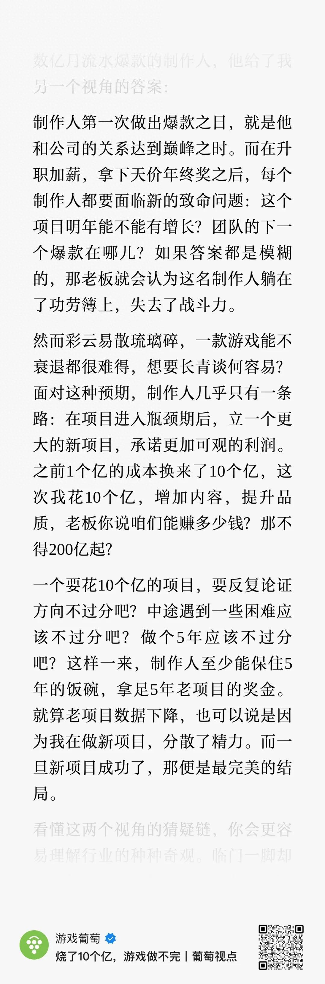 在之前的文章《燒了10個億,遊戲做不完》裏,我們曾討論過爆款製作人的困境: