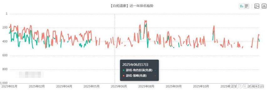 2025年上半年,遊戲大部分時間在遊戲細分的RPG類免費榜裏排名400多,下半年遊戲大部分時間已經跌出遊戲榜了。