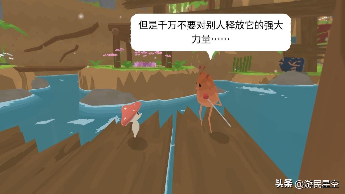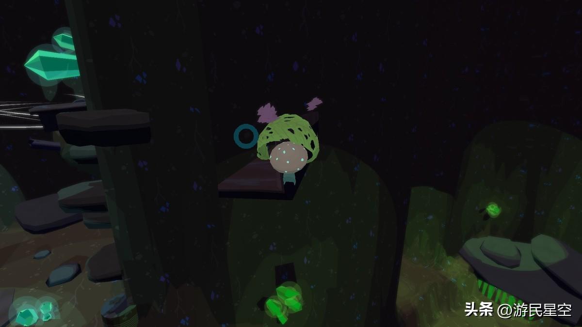 它的玩法相對簡單,你在一座偌大的森林中沒日沒夜地跳,從這頭跳到那頭,一會在樹樁一會在花瓣,撿撿樹枝與漿果,幫助本地原住民完成一些奇奇怪怪的請求,它們會爲你指引回家的路。