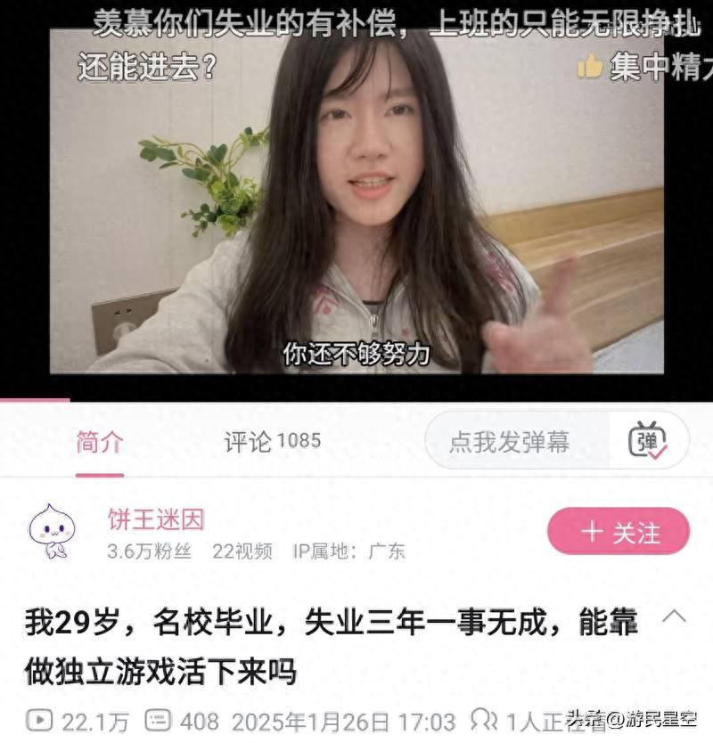 “我29歲,名校畢業,失業三年一事無成,能靠做獨立遊戲活下來嗎”,這是B站UP主兼零經驗遊戲製作人“餅王迷因”,一年前在B站發佈的一條視頻。