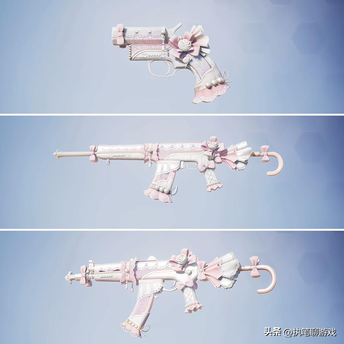 仔細觀察了一會兒後發現,這3個槍皮都穿上了小裙子,這不就是白色版本的“甜蜜誓約”嗎?嘿,如果放到一起來看的話,感覺就像是一個模子刻出來似的。
