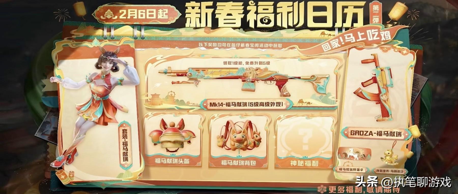 接下來出場的是第二彈的新春福利,從2.6開始,陸續出場的是新套裝“福馬獻瑞”、5級MK14、頭盔、揹包、Groza、掛件、降落傘。